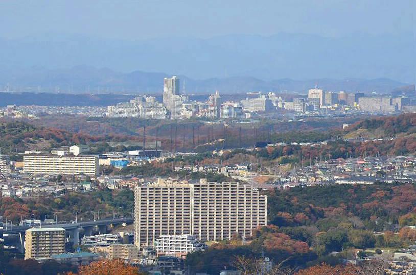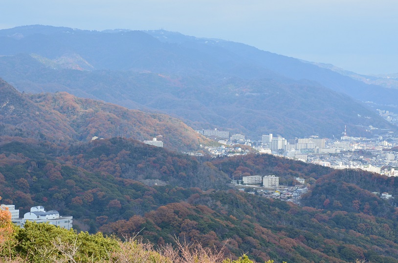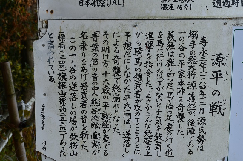 神戸市須磨区須磨浦公園と一ノ谷町 パノラマ)鉢伏山山上より神戸市街を望む 1) ロープウェイと海づり公園 (2)大阪湾 (3)展望台 (4)鉢伏山 (6明石海峡大橋 (7)西神ニュー タウン 8)鵯越(ひよどりごえ)方面 9)須磨海岸 10)旗振山頂上 13〜14義経道 15)義経道 から望む神戸市街 16)源平合戦石碑