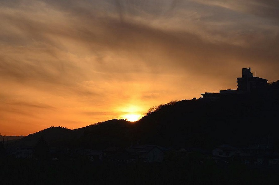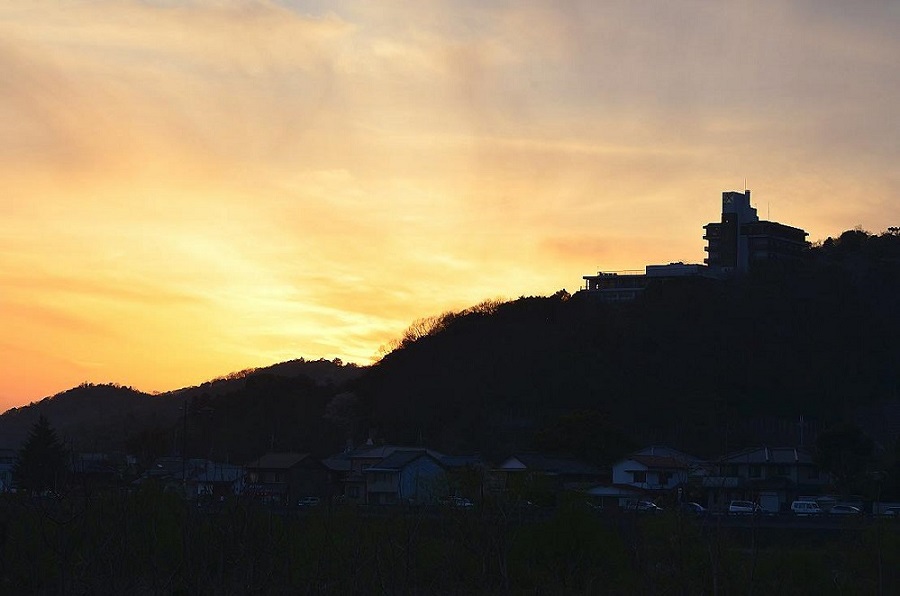 (2)〜(4) 夕暮れ時のたつの市 (揖保川より撮影) (4)右上の建物は赤トンボ荘